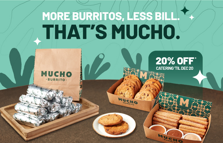 *Offer includes two (2) small burritos, two (2) chips, two (2) salsas, and two (2) canned beverages for $22.95. Offer subject to availability and not valid with any other promotions or discounts. Offer available through the MUCHO Burrito website, app, and in-store on Tuesday only. Additional charges may apply for extras, and delivery.