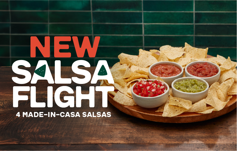 The NEW Salsa Flight brings crispy tortilla chips and 4 house-made salsas together, including our fresh Salsa Cruda. We chop, roast and make our salsas fresh in casa. Made with love. No shortcuts. Just real flavour.