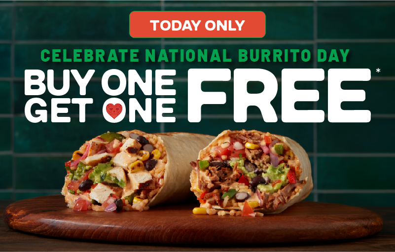 Celebrate National Burrito Day with a BOGO offer on Regular BYO Burritos.🌯 Buy 1 and get 1 FREE* today only. Available in-store, online, and in our app. For digital orders, add 2 Regular BYO Burritos to your cart and the discount will be applied automatically.