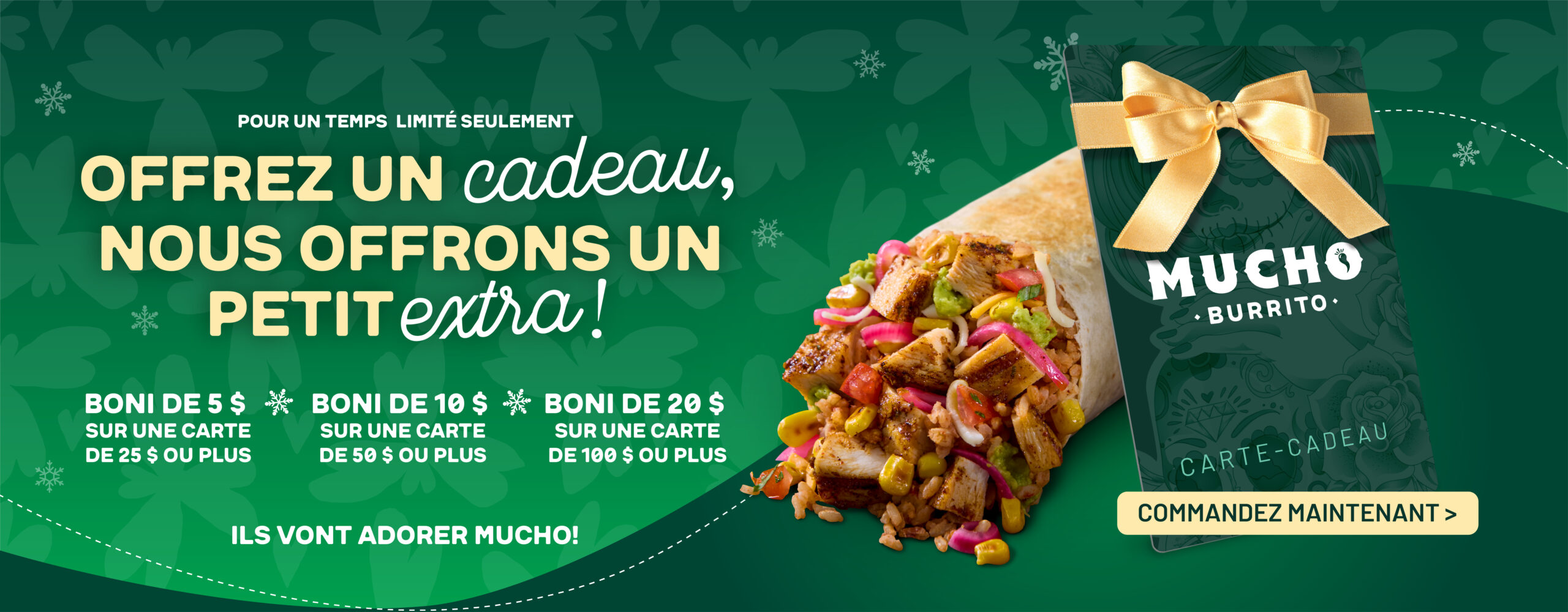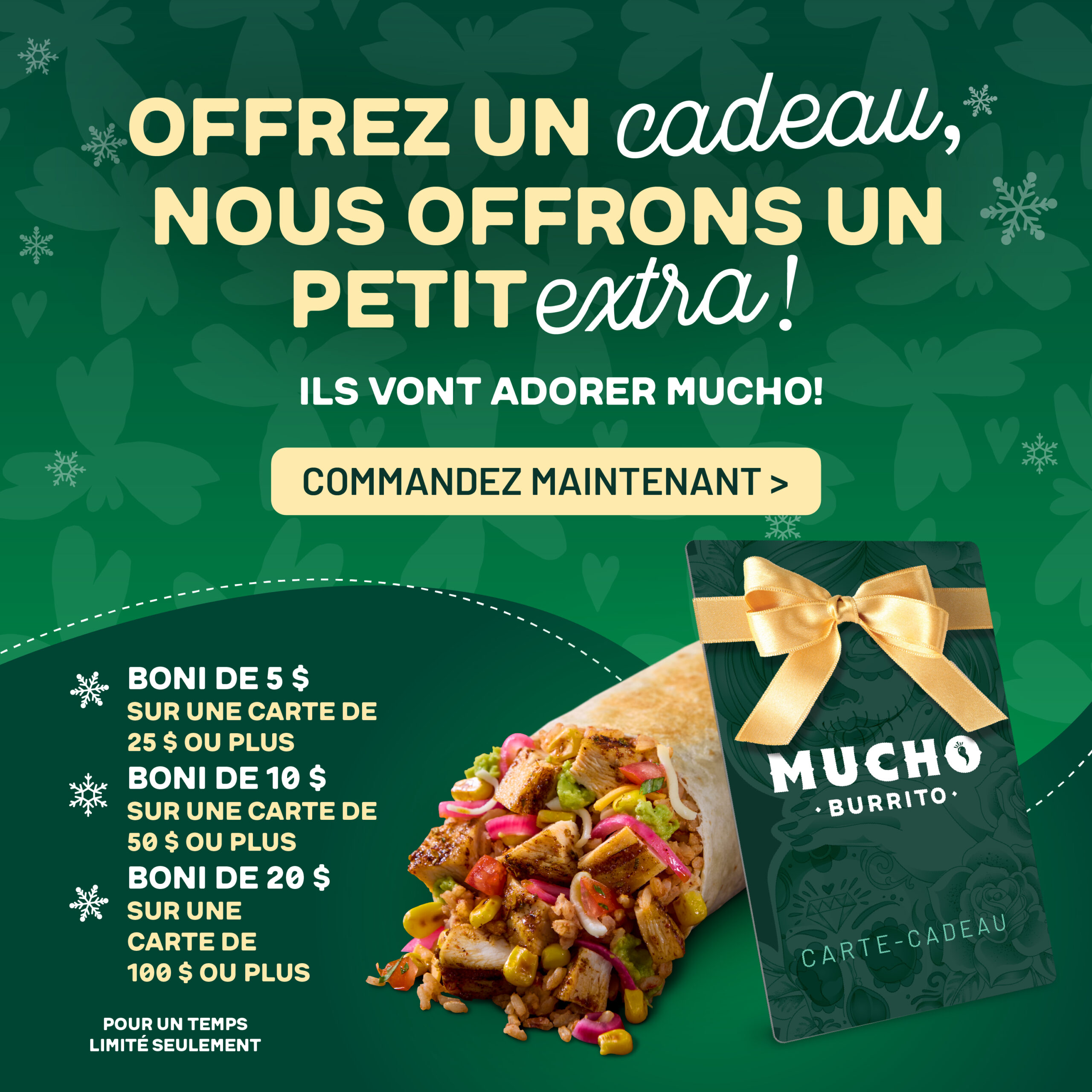 Chaque fois que vous effectuez un achat admissible de 20 $ ou plus lors d’une seule transaction, vous recevrez un poinçon. Une fois que vous aurez accumulé 9 poinçons, vous pourrez échanger votre carte dûment remplie contre un article de menu GRATUIT ! Vous aurez le choix d’échanger votre carte contre l’un de nos cinq plats préférés – un petit burrito, une quesadilla, un taco-trio, un bol ou une salade !