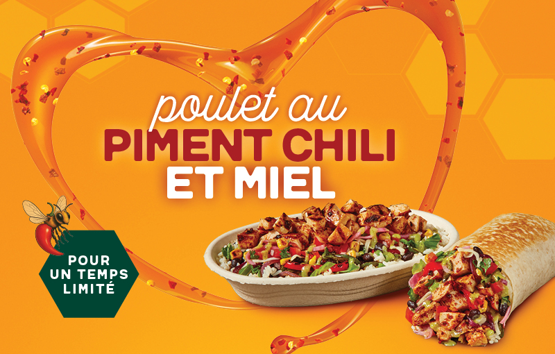 Serrano piquant et miel doré canadien. Le Poulet au piment chili et miel de MUCHO Burrito est offert pour un temps limité!