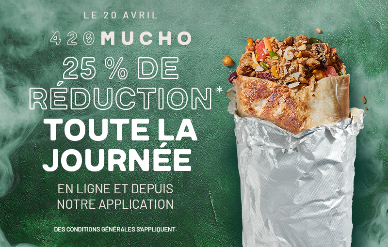 *L’offre comprend un burrito sur mesure de tout format, d’une salade, d’un bol, d’un trio de tacos ou d’une quésadilla. L’offre est sous réserve de disponibilité. L’offre ne peut être jumelée à aucune autre offre ou réduction. L’offre est valable le vendredi seulement, sur le site ou sur l’application de Mucho Burrito, ou en succursale. Des frais supplémentaires peuvent s’appliquer pour les extras et la livraison.