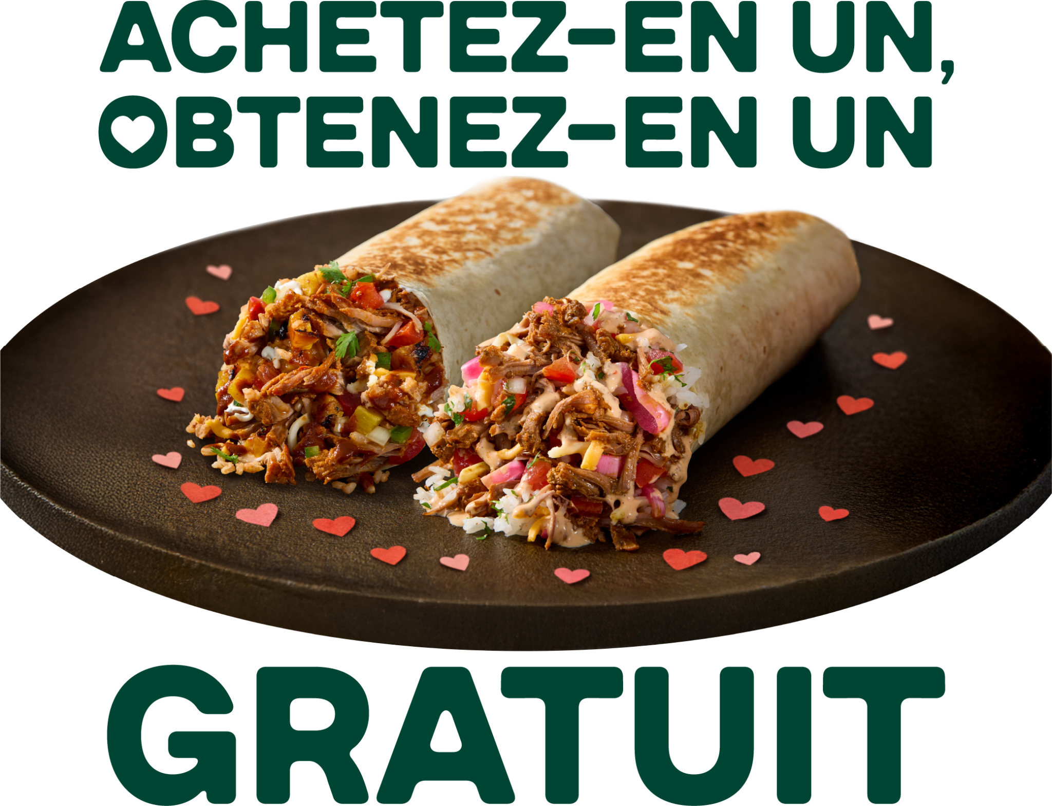 Le 14 février seulement, lorsque vous achèterez un bol ou un burrito sur mesure de format classique ou MUCHO, nous vous en offrirons un deuxième gratuitement.