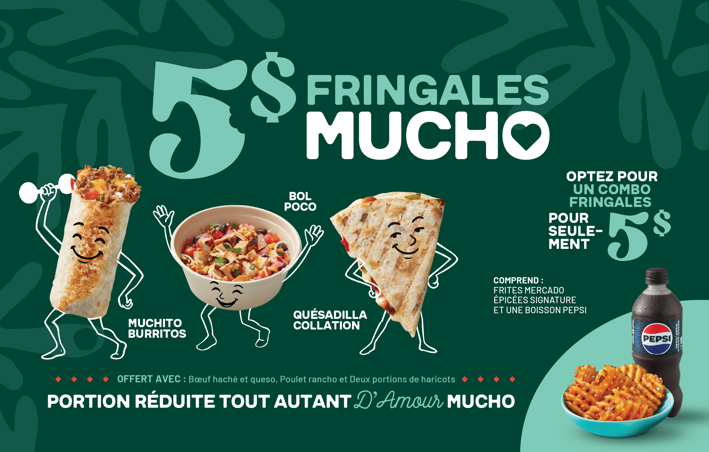 Une saveur MUCHO intense pour seulement 5 $. Choisissez parmi les Snackadilla, les Poco Bowl ou les Muchito Burritos. Vous n’arrivez pas à vous décider ? Prenez-les tous et savourez la saveur MUCHO à l’infini. Vous pouvez également opter pour un combo pour seulement 5 $ de plus et déguster des frites Mercado épicées signature accompagnées d’une boisson Pepsi rafraîchissante.