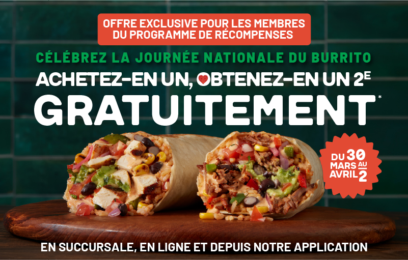 Célébrez la Journée nationale du burrito avec une offre « un acheté, un offert » sur les burritos classiques à composer soi-même. Achetez-en 1 et obtenez-en 1 GRATUIT le 2 avril, avec un accès anticipé exclusif pour les membres du programme de fidélité du 30 mars au 2 avril. Vous n’êtes pas encore membre ? Rejoignez MUCHO Rewards dès aujourd’hui pour bénéficier d’un accès anticipé et profiter de l’offre plus tôt. Disponible en magasin, en ligne et sur notre application. Pour les commandes en ligne, ajoutez 2 burritos classiques BYO à votre panier et la réduction sera appliquée automatiquement.