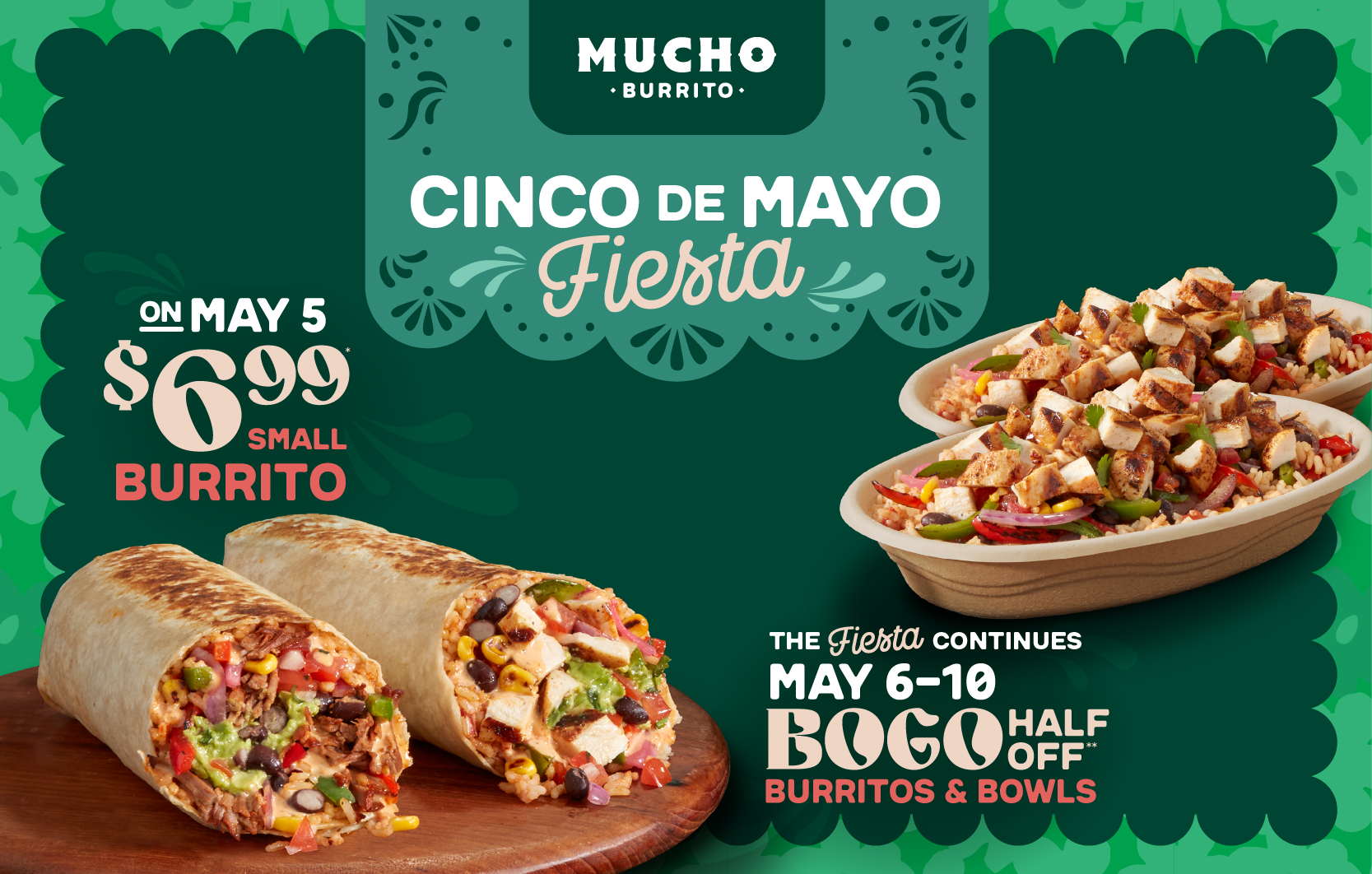 *Offer includes two (2) small burritos, two (2) chips, two (2) salsas, and two (2) canned beverages for $22.95. Offer subject to availability and not valid with any other promotions or discounts. Offer available through the MUCHO Burrito website, app, and in-store on Tuesday only. Additional charges may apply for extras, and delivery.